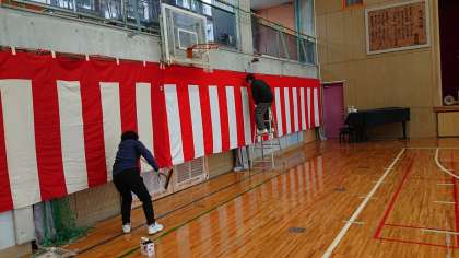 今日の午前中は、主事さん4人が卒業式に向けて体育館に紅白幕を設置してくれています。