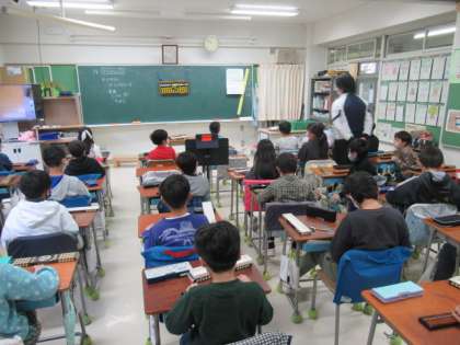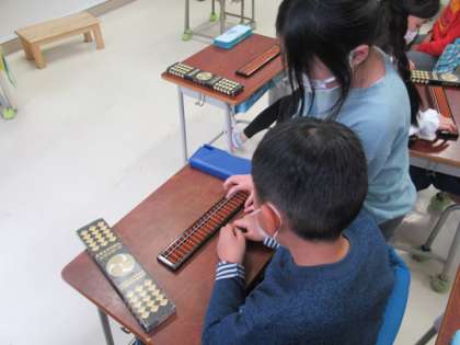 こんな質問から始まった今日の学習。「電卓?計算機?」子どもたちの「??」が浮かびます。「実は、昔はそろばんを持っているということは、スマホを持っていることと同じなんだ!」と、言うと子どもたちは驚いていました。今回の学習では、そろばんの技能ではなく、そろばんんぽ便利なところを見つけます。そろばんに触れる中で、昔から使われている道具の使い方や使う人の思いを感じてほしいと思います。
