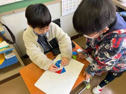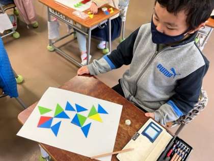 今日の算数の学習では、色板を使ってパズル大会をしました。