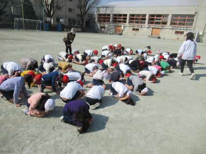 自分の身を守るために、ダンゴムシのポーズをして頭を守ります。校庭などの広い場所にいるときは、中央に集まって安全を確保します。どの子も真剣にできていました。