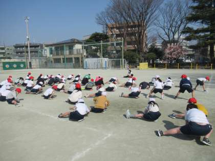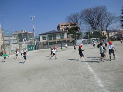 次に、学年全体で「リズムストレッチ」と「ふえおに」をしました。1年生みんなでやる鬼ごっこは、とても楽しそうでした。