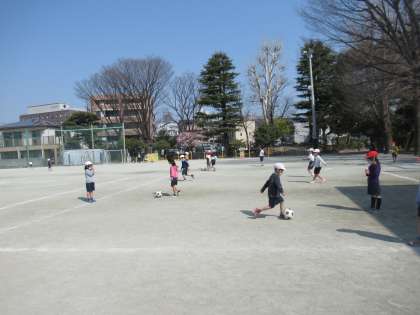 2人組でパスやドリブル、シュートの練習をしました。初めてボールけりをした子も多くいましたが、「いいね!」「ナイス!」などとお互いに声をかけながら練習を重ねるうちに、どんどん上達していきました。楽しみながら一生懸命に取り組むすてきな姿がたくさん見られました。