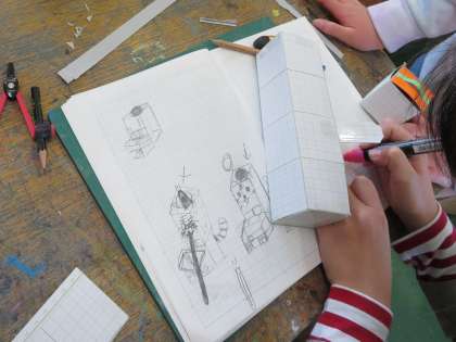 ノートに下書きを描いてから作ったり、作りかけのロボットを見ながらひらめいた工夫を実現しようとしたり楽しく取り組んでいます。