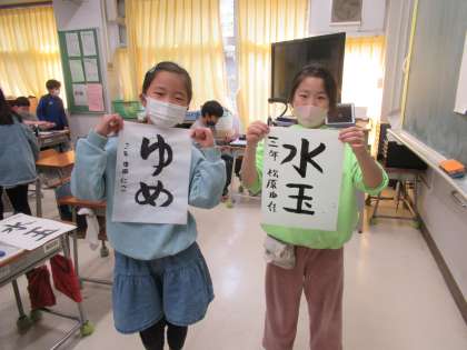 3年生から始めた習字の学習のまとめをしました。止め、はね、はらい、折れ、曲がりなどを確認しました。子どもたちの姿勢もよくなりました。「ゆめ」「水玉」のどちらかを選んで清書しました。「先生、見て。」「うまく書けたよ。」友達の作品を見て、上手なところを伝えている子どももいました。認め合う姿が微笑ましかったです。