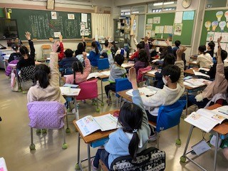 2年生は道徳で「ドッジボール」という題材を学習しました。ボール運動があまり得意ではない子と同じチームになって、その子が当てられてしまったときの声かけの違いについて話し合いました。ちょうど、体育でボール運動をしていることもあり、自分のこととして考えられたようです。「励ましの声かけをすればよかった。」「優しく言ったほうがよかった。」「強く言わないように気を付けよう。」「優しい言い方を見習おう。」など、たくさんの意見が出ました。これからの生活で気を付けていけるといいですね。