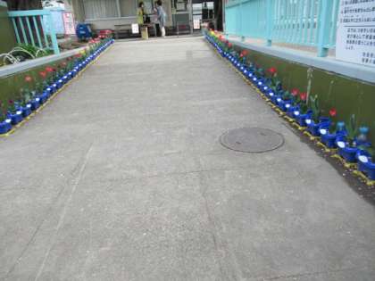 昨日、新6年生の子どもたちが一生懸命準備に取り組み、式場の体育館と1年生の教室では、新1年生のみなさんと保護者の皆様を迎える準備ができました。正門から入ったスロープでは、昨年度の1年生がお世話をしているチューリップの花が美しく咲き、新入生を迎えます。