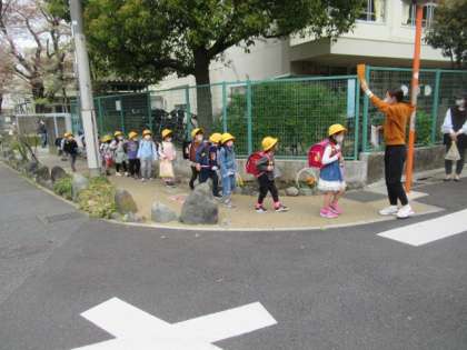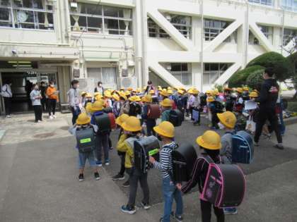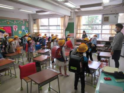 教室で下校の仕方について話を聴いた後、1年教室前の廊下と2階渡り廊下でコース別(色別)の場所に移動しました。その後、靴箱まで並んで移動し、靴を履き替えて中庭スペースにコース別に集まりました。みんなで元気よく「さようなら」のあいさつをして、1年担任と学校主事が引率して、コース別(色別)に下校しました。