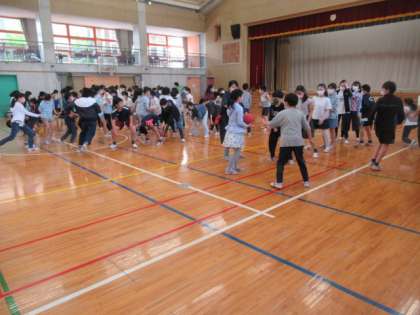 6年生は体育館で、“ボール運びゲーム”をして元気タイムの時間を過ごしました。