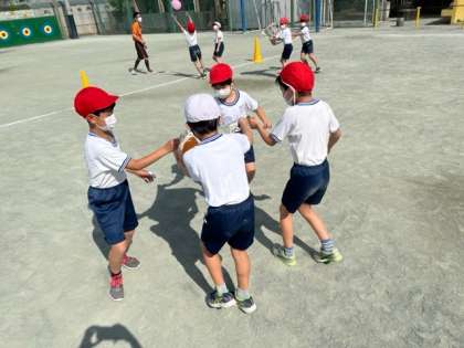 2.3組の合同体育では、体ほぐしの運動として風船を使ってリレーを行いました。背中に風船を挟んだり、新聞紙の上にのせて運んだりしました。これが意外と難しい…。子どもたちは、苦戦しながらも楽しんで行っていました。