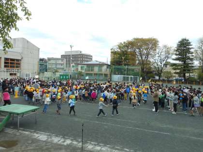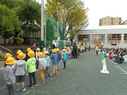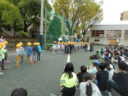 今年度初めて1年生から6年生全員が校庭に集合し、「1年生を迎える会」を実施することができました。
