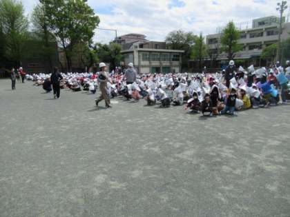 今回の想定は、南校舎南側の近隣で火災が発生し、第1避難場所の校庭に安全に避難することでした。緊急放送を静かに聴き、「お・か・し・も」(おさない・かけない・しゃべらない・もどらない)の約束をしっかりと守り、安全に気を付けて避難することができました。