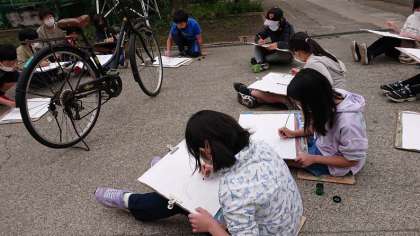 今日の3・4校時は、図画工作の学習で4・5年昇降口前で自転車をよく見て描く活動に取り組みました。