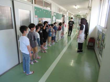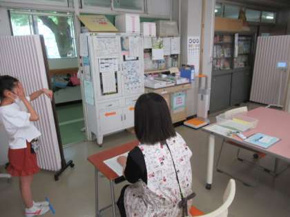 1時間目に3組、2時間目に2組、3時間目に1組が保健室で視力検査を行いました。検査の仕方について説明を受け、順序よく検査を受けていました。