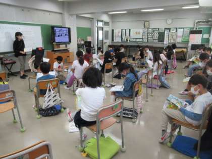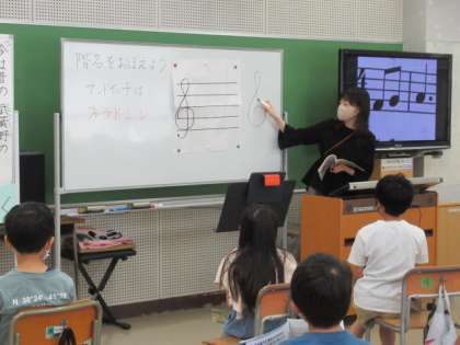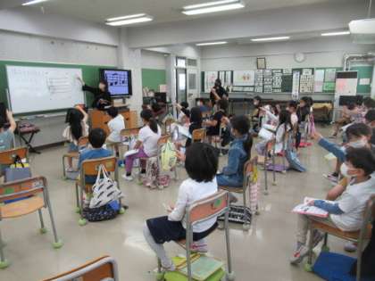 みんなで記号の形と書き順を確認して、手で空中で書く練習を繰り返していました。「おもしろい!」「ちょっとむずかしいな!」「かんたんに書けるよ!」など、新しい楽譜記号を学んでいました。新しい出会いに、これからの音楽の学習が楽しみな子どもたちです。