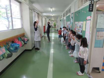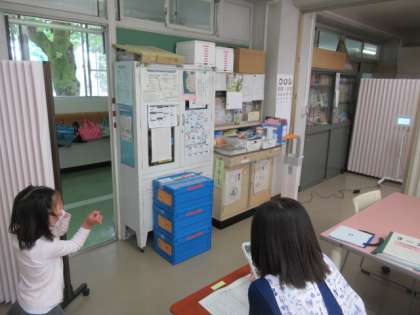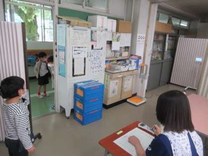 今日は、1年生の視力検査の日です。1時間目から学級ごとに割り当ての時間に行っています。