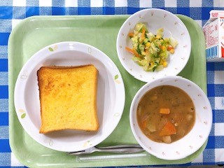 フレンチトーストは、卵・さとう・牛乳・バニラエッセンスを合わせたものを、パンに染み込ませて焼いています。じっくり時間をかけて染み込ませることはできませんが、一枚一枚、パンの両面に丁寧につけて、よりおいしくなるようにしています。明日からの連休を元気に過ごすためにも、給食をしっかり食べましょう!