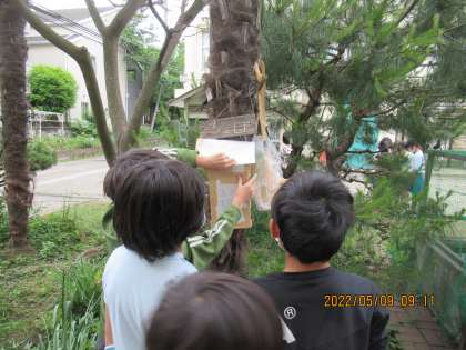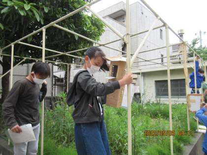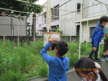 また、記録をするために、自分たちでミニ百葉箱を作成し、思い思いの場所に設置しました。