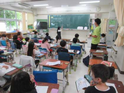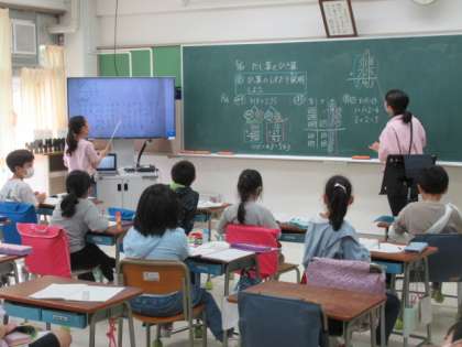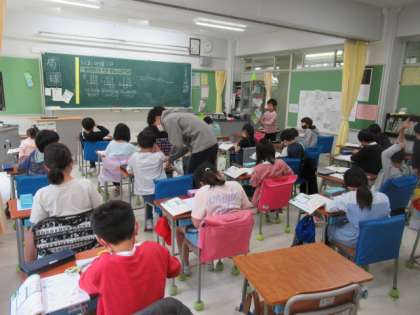 今日の5時間目、3年生は4つのグループに分かれて算数の学習「たし算とひき算」に取り組んでいました。