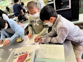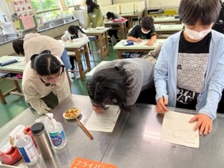 昨日の家庭科の学習では、先生が作った野菜炒めの料理を見て「どのような手順で作ったのだろうか。」という課題について、考えました。友達と一緒に料理を見ながら、「まず、野菜から炒めたのかな?」「野菜にも炒める順番はあるのかな?」など、言葉を交わしながら学習を進めました。