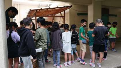 4年2組は、理科の学習で1日の気温の変化について調べるために準備を行うために1階渡り廊下へ行きました。
