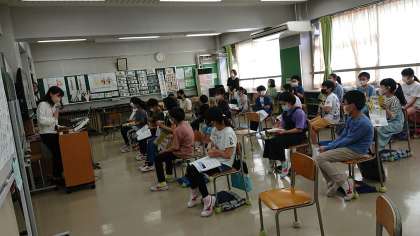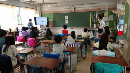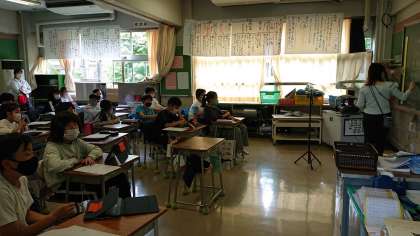 5年生の3校時は、1組が「音楽」、2組が「社会」、3組が「外国語」の学習に取り組んでいます。