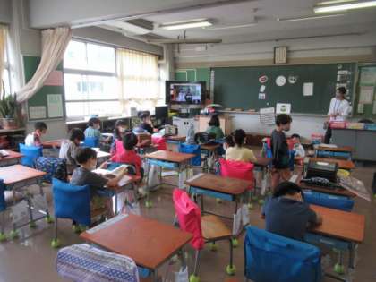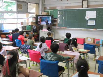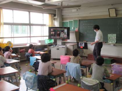 1年生にとってオンライン(Zoom)を活用した集会への参加は、初めての経験です。図工室から教室の大型テレビモニタに映像と音声が届き、笹原小学校についての楽しいクイズに、一生懸命に考えて回答していました。