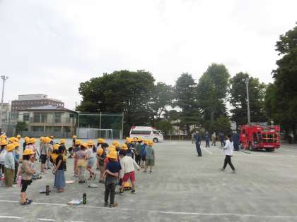 今日は、1・2年生合同で、宮ノ坂出張所のご協力のもと、校庭に消防車と救急車を停めて間近で写生をしました。天気予報では、雨が心配でしたが、見事に晴れて写生会を行うことが出来て一安心でした。