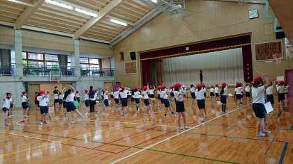 運動会に向けて、エイサーの踊りについて知り、舞台の上の先生の踊りを真似ながら、学年全員が踊ります。