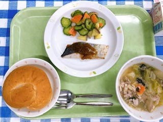 ハニーマスタードサラダは、ドレッシングに砂糖の代わりにはちみつを入れています。はちみつは、砂糖に比べて甘味が強いので、少しの量でも甘味を感じることが出来ます。また、ビタミン、ミネラルなどの栄養がたくさん入っていたり、おなかの調子を整えてくれたりと、食べるとうれしいことがたくさんあります。野菜と一緒に食べると、その効果がもっと増えるので、しっかり食べましょうね。