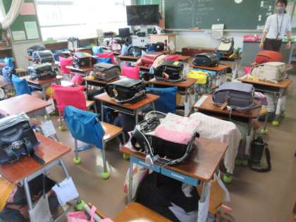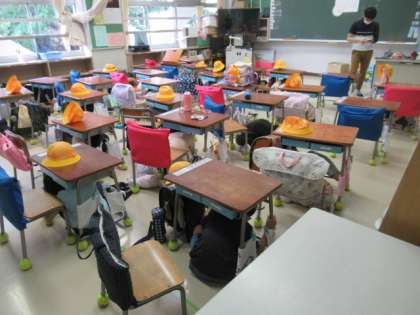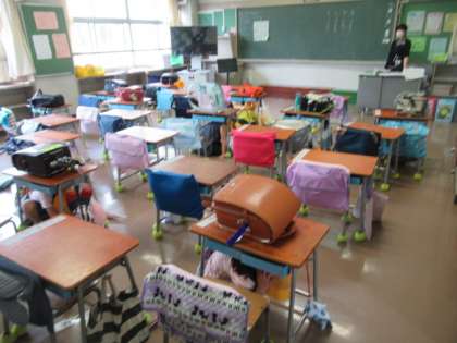 今日は、大規模地震が発生したことを想定し、自分の身の安全を確保する訓練「シェイクアウト訓練」を行いました。日頃から訓練で行っている行動ですが、緊急放送の指示も確認しながら真剣に取り組んでいました。