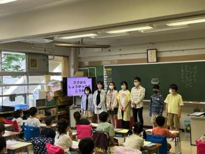 本日の朝の時間を活用して、6年生が1年生に校歌の魅力、歌うときのポイントなどを伝えに行きました。6年生が歌った動画を、1年生に見せながら紹介することができました。1年生が上手に歌えるようになったら、6年生にもまた聴かせてほしいです♪