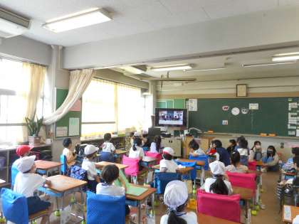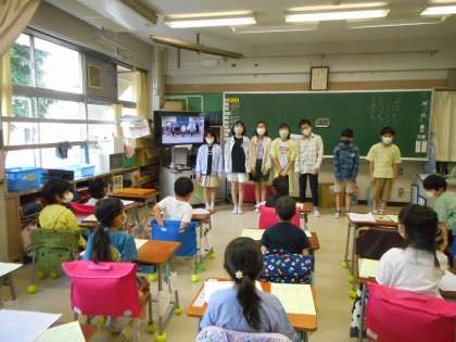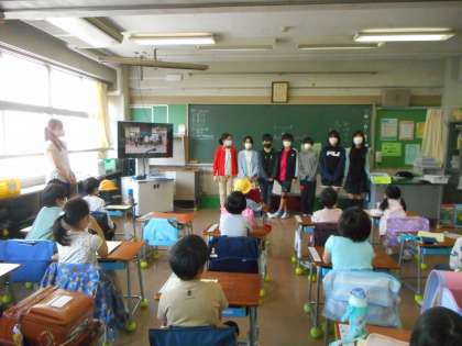 出来上がった動画を、今週1年生の各学級に届けました。1年生の教室はしーんと静かになり、動画をじっくりみたり、ひらがなの歌詞を読んだりと、一生懸命覚えようとしていました。