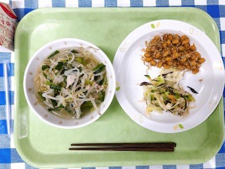 今日は、地味だけれど笹原小学校のかげの人気者である「大豆とじゃこの甘辛揚げ」です。大豆はしっかりとゆでてから、粉をつけて油でカリカリに揚げています。それをカリカリに焼いたじゃことあわせて、あまじょっぱい味にしました。おいしいうえに、カルシウムやたんぱくしつが豊富で、栄養満点です!