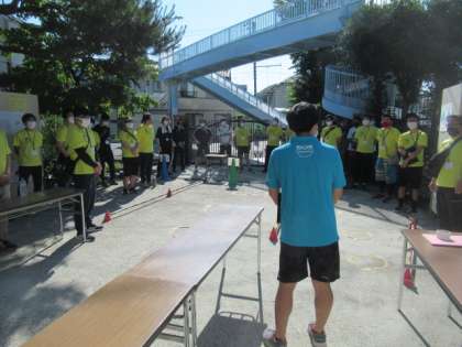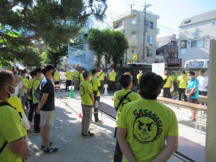 今日は、オンラインでの中継映像の制作、会場の受付や案内、巡回での警備などを分担し、子どもたちの運動会の運営を支援していただきます。黄色のTシャツ・おやじの会の会員ネームプレートを着用して活動します。