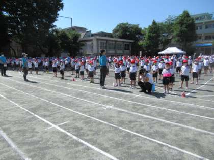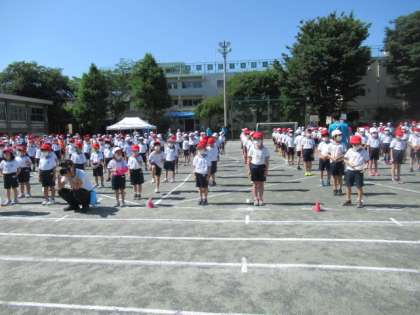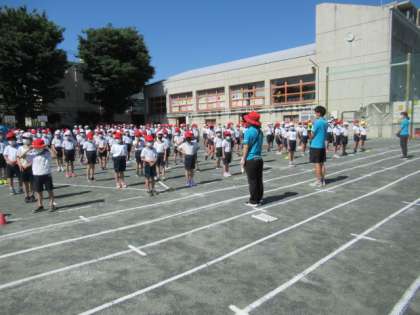 校庭いっぱいに間隔をあけて「はじめの運動」の隊形で列し、いよいよ運動会の始まりです。