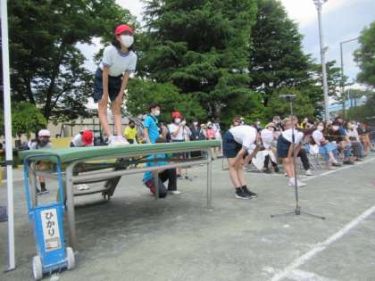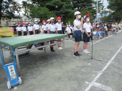 高学年の部が終了し、オンラインで教室で中継映像を通して参観・応援していた中学年・低学年も校庭に集合し、全校で閉会式を行いました。