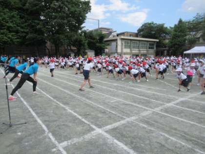 6年生の進行係が司会を務め、最初に「おわりの運動」を行いました。おわりの運動担当の6年生がリードして、体をほぐしました。