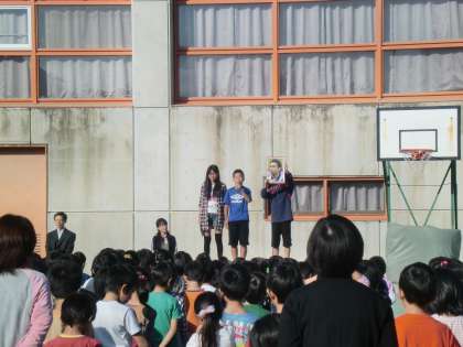 真っ青な青空の下での児童朝会でした。初めに、少年野球の表彰を行いました。(写真が撮れず、すみません。)学校だけでなく、いろいろな場面での活躍は頼もしいです。今日の6年生のスピーチは、3人がそれぞれボールペン、サッカー、連合運動会のことについてお話してくれました。いつもながら、しっかりお話を聞いている子どもたちの姿は立派です。