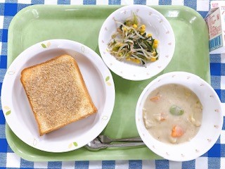 今日は歯科健診がありましたね。むし歯があるのではとドキドキした人もいると思います。健康な歯でいるためには、毎日の歯磨きとバランスのよい食事が大切です。今日の給食は、歯をつくるのに欠かせない「カルシウム」がたっぷり入ったメニューです。セサミトーストのごま、ソテーのこまつな、クリームシチューに入っている牛乳やスキムミルクは、カルシウムが豊富な食べ物です。しっかり食べて、丈夫な歯をつくりましょう!