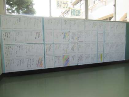 また、2階渡り廊下掲示コーナーでは、あいさつへの思いや願いを込めたすてきな「あいさつ標語」が発表・紹介されています。