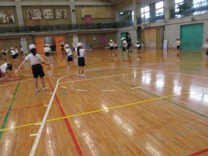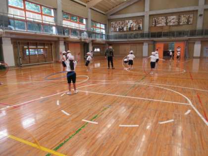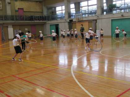 学習のめあてと流れを確認し、準備運動を行い体をほぐしました。運動するときの約束を確かめ、一人1つのフープを使っていろいろな動きに挑戦し、みんなで楽しみました。