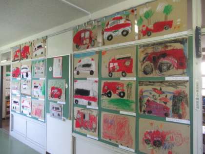 消防車と救急車を実際に見て、車体の形や大きさ、細かな部分までよく観察をして描きました。それぞれの作品に、初めて間近で見る消防車両への子どもたちの「描きたい!」意欲がつまっています。クレパスを上手に使って、色を濃く塗ることにも、一生懸命取り組みました。