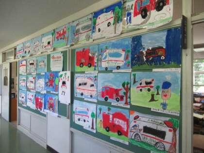 2年生が5月12日に参加した「はたらく消防の写生会」の作品が完成し、各教室の廊下掲示コーナーで展示・紹介されています。