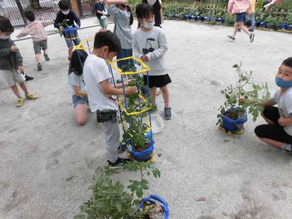 連日の雨で育てている野菜の様子が心配になり、2年1組では野菜の様子を確認しに行きました。心配した通り、茎が折れてしまっている子がちらほらいました。ぐんぐん育ってきているので、支柱を持ってきた子は支柱に茎をひもで結びました。雨や風に負けないように、支柱で支えてあげると少し安心ですね。梅雨の合間にもお世話を続けていきたいと思います。