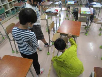 続いて、もっと長い長さである「教室の横の長さを測ろう。」との問いに、友達と協力してものさしをつないで試行錯誤しながら工夫して測っていました。グループで結果に差が出たことから、長い長さを測る道具として「まきじゃく」があることを知り、次回の学習で巻尺を使って教室の横の長さなどを測ってみようということになりました。
