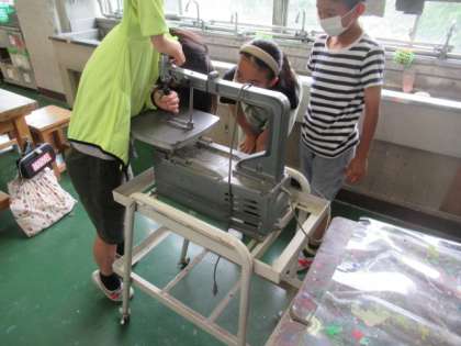 刃物を使う時の約束を確認し、電動糸のこぎり使い方を教員自作の動画を視聴して理解し、グループごとにアドバイスをし合ったり繰り返し試してみたりしながら、電動糸のこぎりを体験しました。