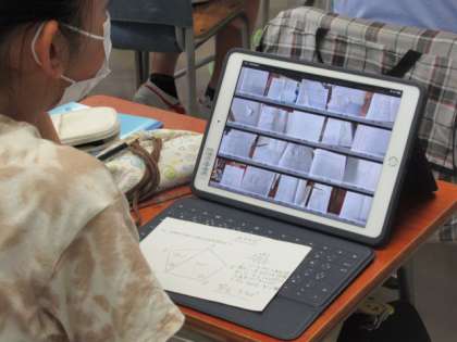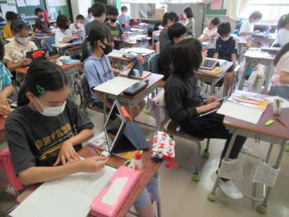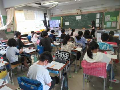今日の2時間目、5年生は算数の単元「合同と三角形、四角形」の全14時間中の第11時目の学習に、4グループに分かれて取り組んでいました。