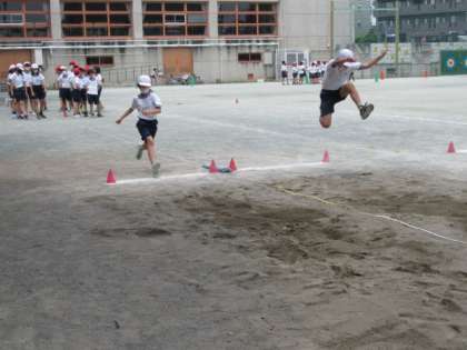 今日の3時間目の校庭では、5年3組が体育の学習で陸上運動「走り幅跳び」に取り組んでいました。