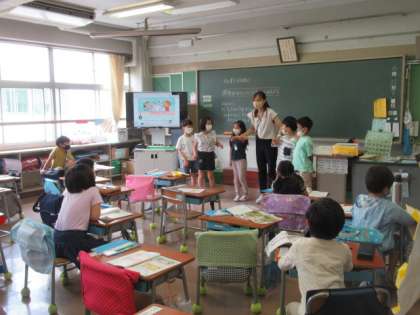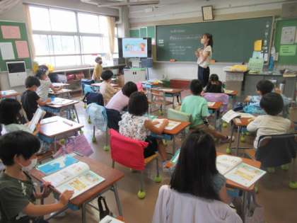 今日の2時間目、1年2組の教室では、学習のめあてを「あわせていくつになるかかんがえよう。」として、絵を見て数のお話をつくり、算数ブロックや具体的な動作を取り入れながら「合わせる」をキーワードに考えを深めていました。