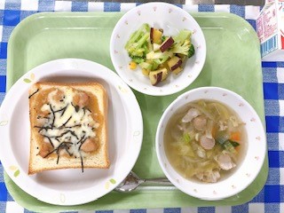 今日は「さくらの学び舎給食」です。笹原小学校と桜丘小学校、桜丘中学校でおすすめメニューを交換して実施しています。今日は桜丘小学校のおすすめメニューである「照り焼きチキンピザトースト」を教えてもらいました。和風な味付けの照り焼きチキンを、ピザにアレンジしたユニークでおいしいメニューです。